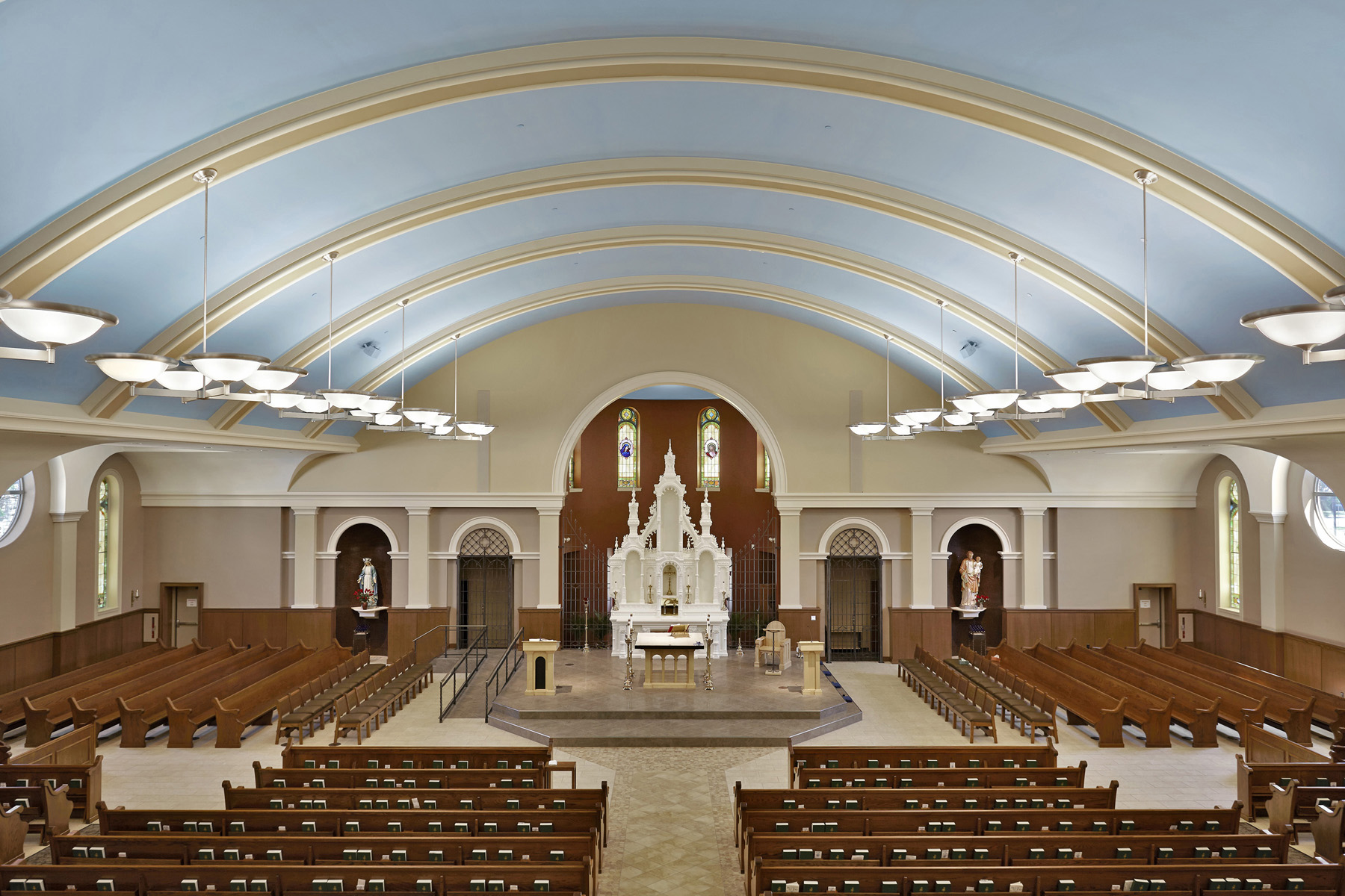 A new sanctuary and bell tower stand in place of the older, smaller sanctuary and tower. The 713-person worship space is designed in the form of a central aisle and cruciform. A wide, low-barrel vault glows with a soft sky-blue color and strategically located windows at the apse and transept wash the sanctuary in natural light. The original reredos (high altar) has been completely refinished and restored in bright white.